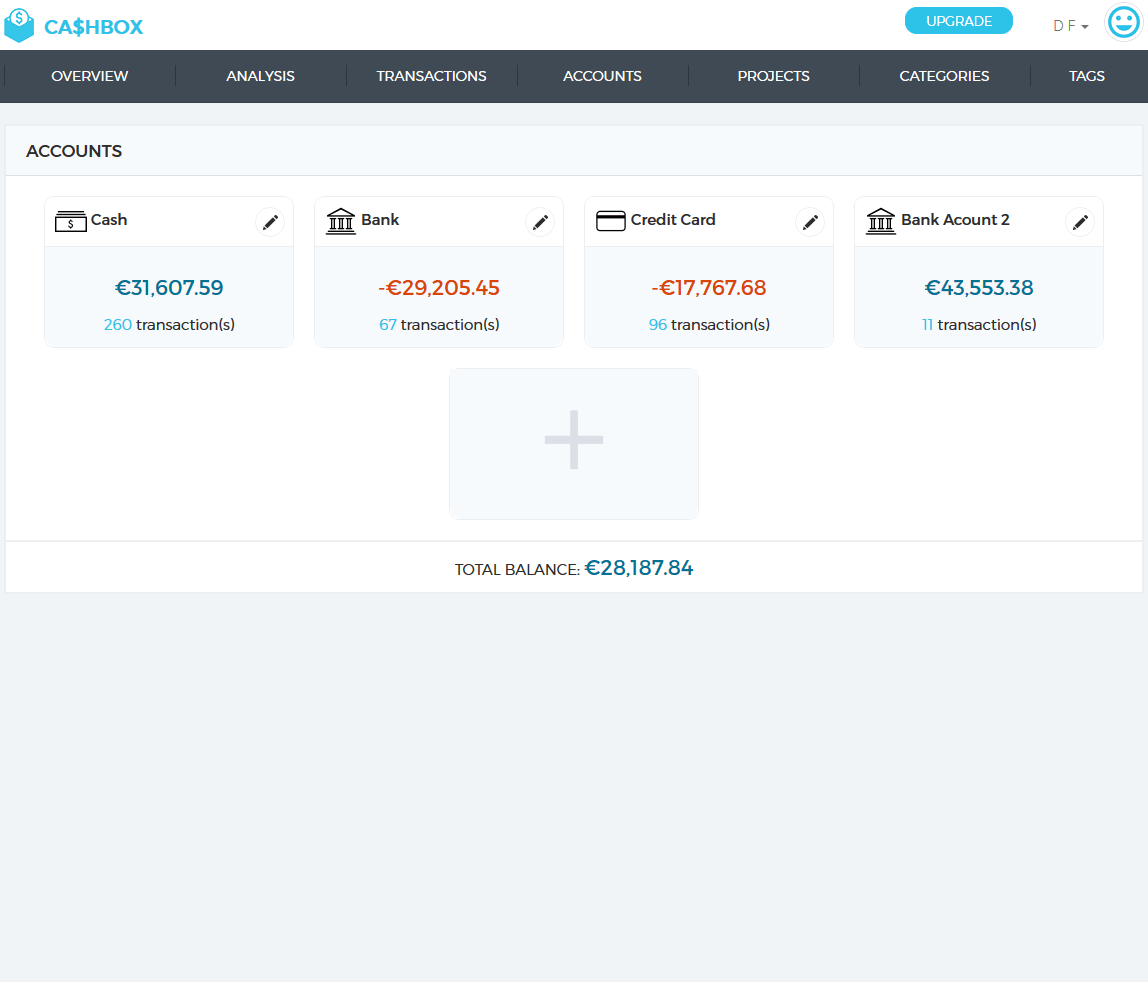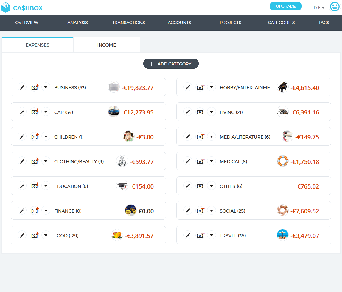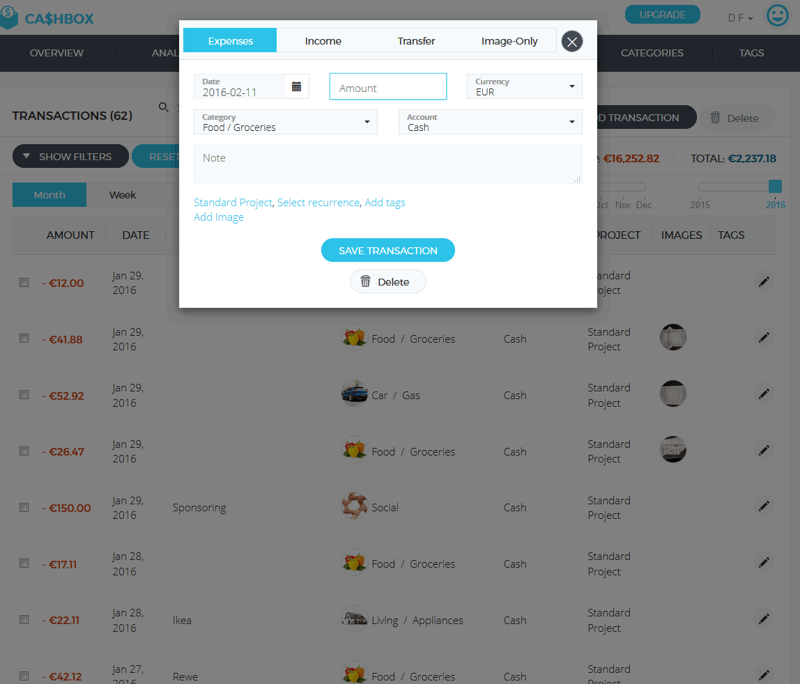 In cashbox you enter all your expenses and income to keep track of them. At the end of the month you see exactly how much money you spent and on what.