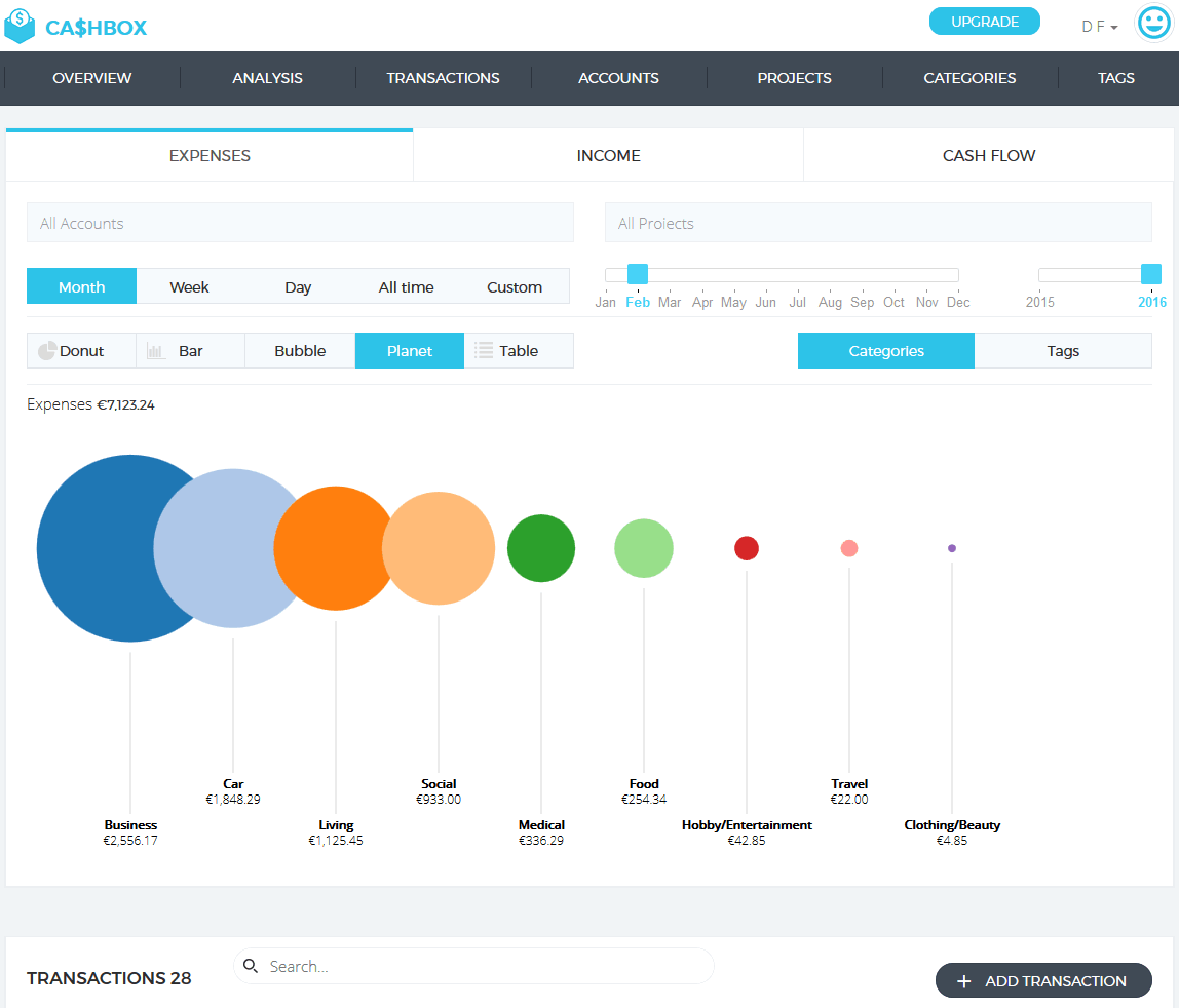 Nice and intuitive graphical presentation of your financial status. Just feel how you spend and earn and have fun optimizing it!